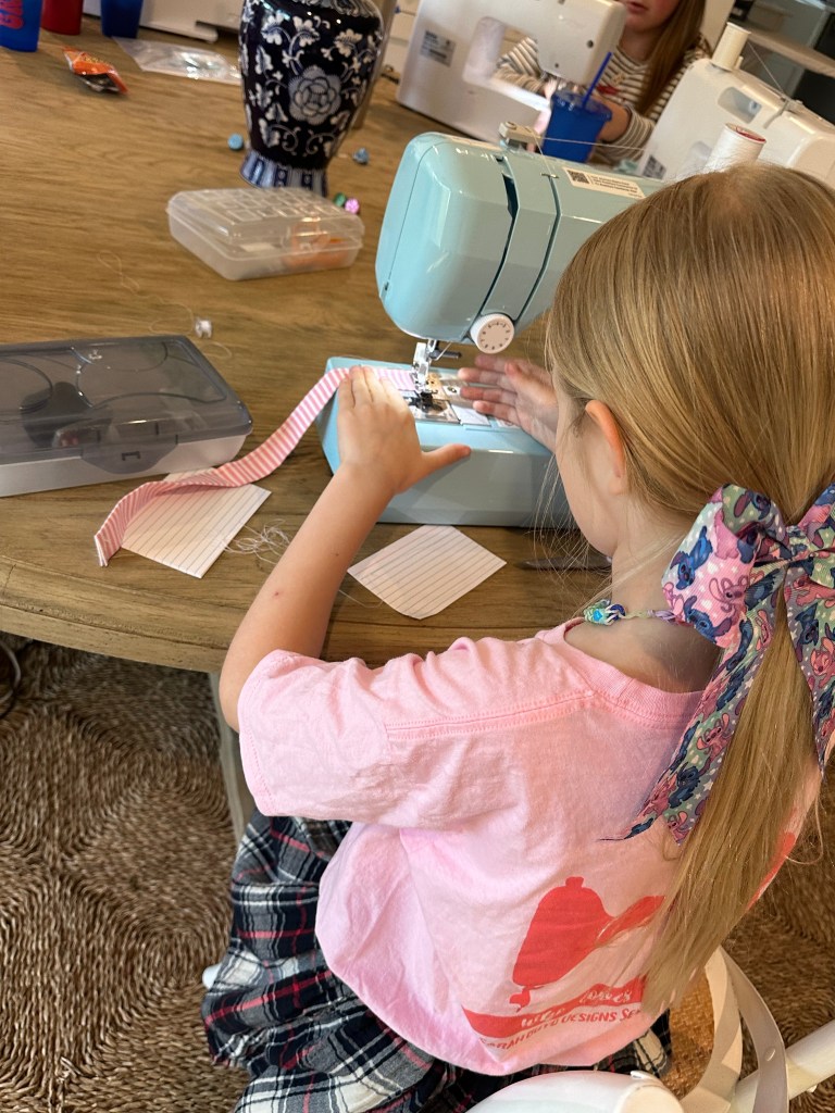 I had three girls who had never used a sewing machine before. So…we started off getting acclimated with our machines. Once they felt comfortable with the different parts of the machine we “warmed up” using a note card. We practiced following the lines and getting a feel for the machine.