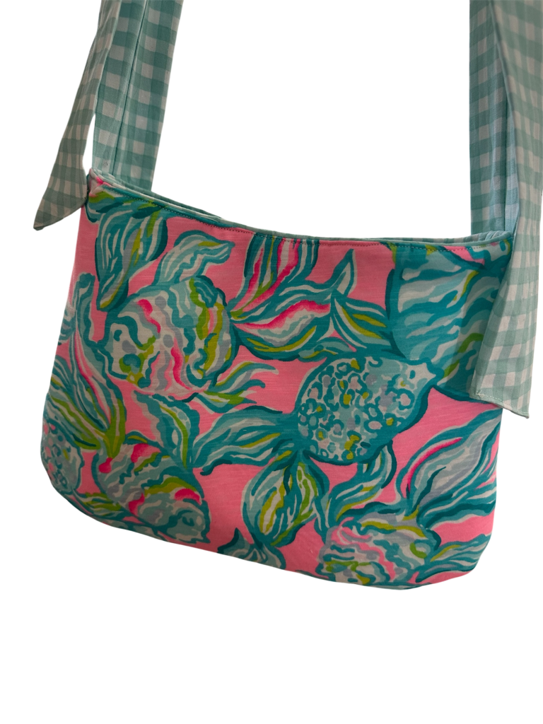 For our March sewing party we will be making fully lined and adjustable shoulder/crossbody bag with magnetic closure and Lily Pulitzer and Gingham fabric! Scroll down to view more photos.